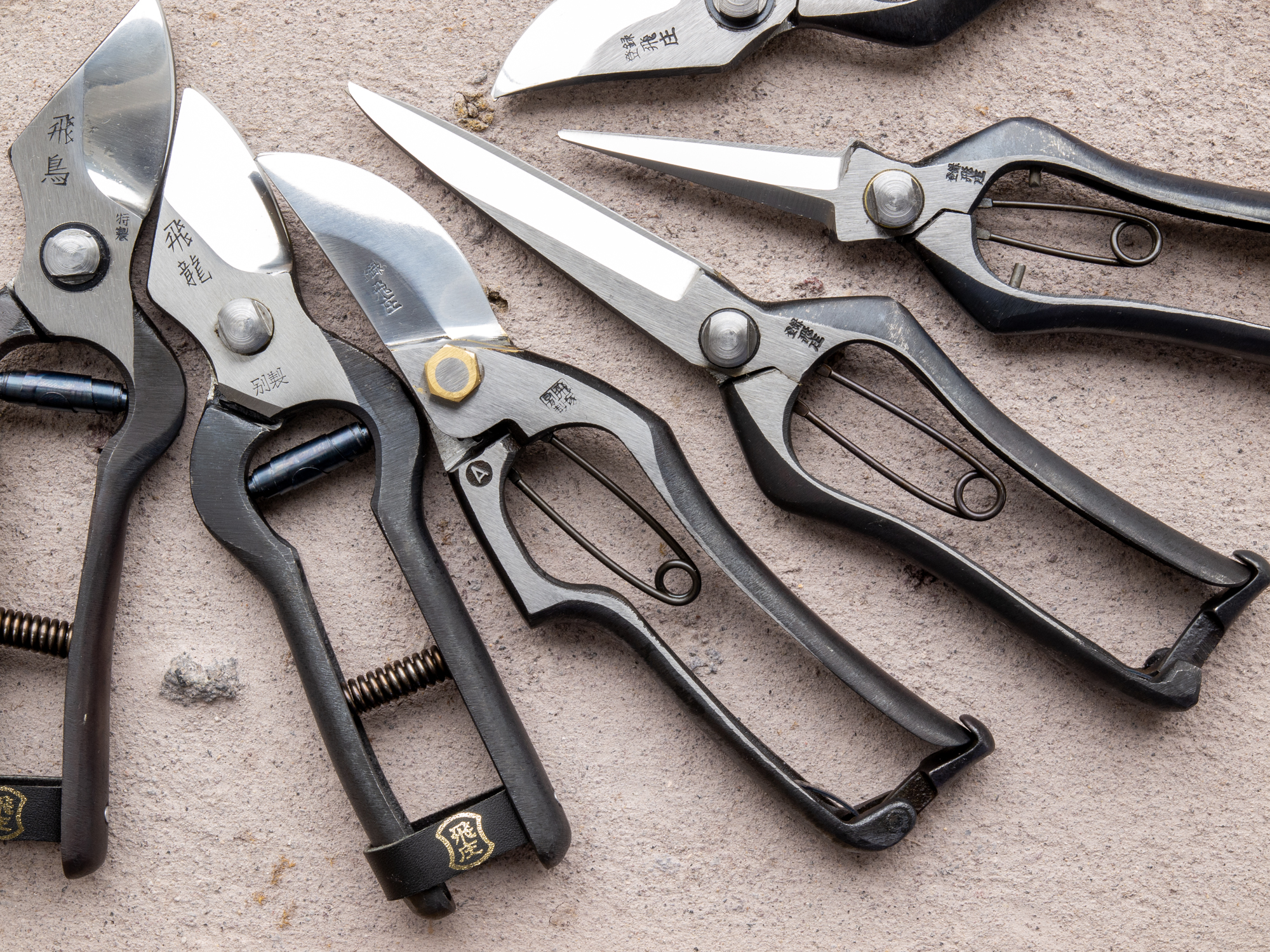 明治時代から日本の剪定鋏の歴史がスタートしますが、飛庄はその中でも山形県内で発達した桑や果樹用の剪定鋏鍛冶屋に端を発します。初代の飛塚庄次郎さんは、県内でいち早く製造を開始した製鋏所で剪定鋏づくりを修行し、独立。飛塚製鋏所を開業しました。実直なものづくりを続けていく中で大きな変化が起こったのは、3代目の飛塚靖仁さんの時代。もっと切れるように・使いやすいようにと、既存の鋏の改良や新型の開発を行いました。代表的なものはA型とB型の長所を併せ持ったSR型の開発、構造そのものを見直したNew-A型への改良、他に類を見ない刃合わせがない飛龍型の開発などです。時は流れ、今は4代目の飛塚大貴さんの時代。『質実剛健』のものづくりを基本に、さらなる改良や開発に意欲的に取り組んでいます。世界でも評価が高く、日本を代表する剪定鋏メーカーです。